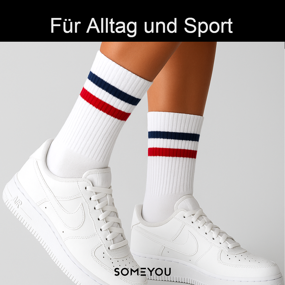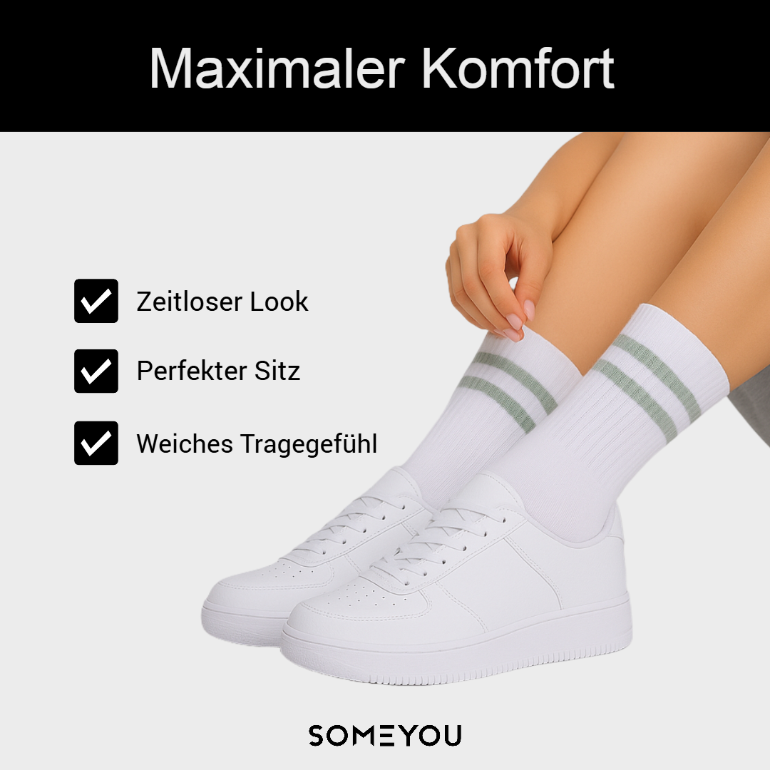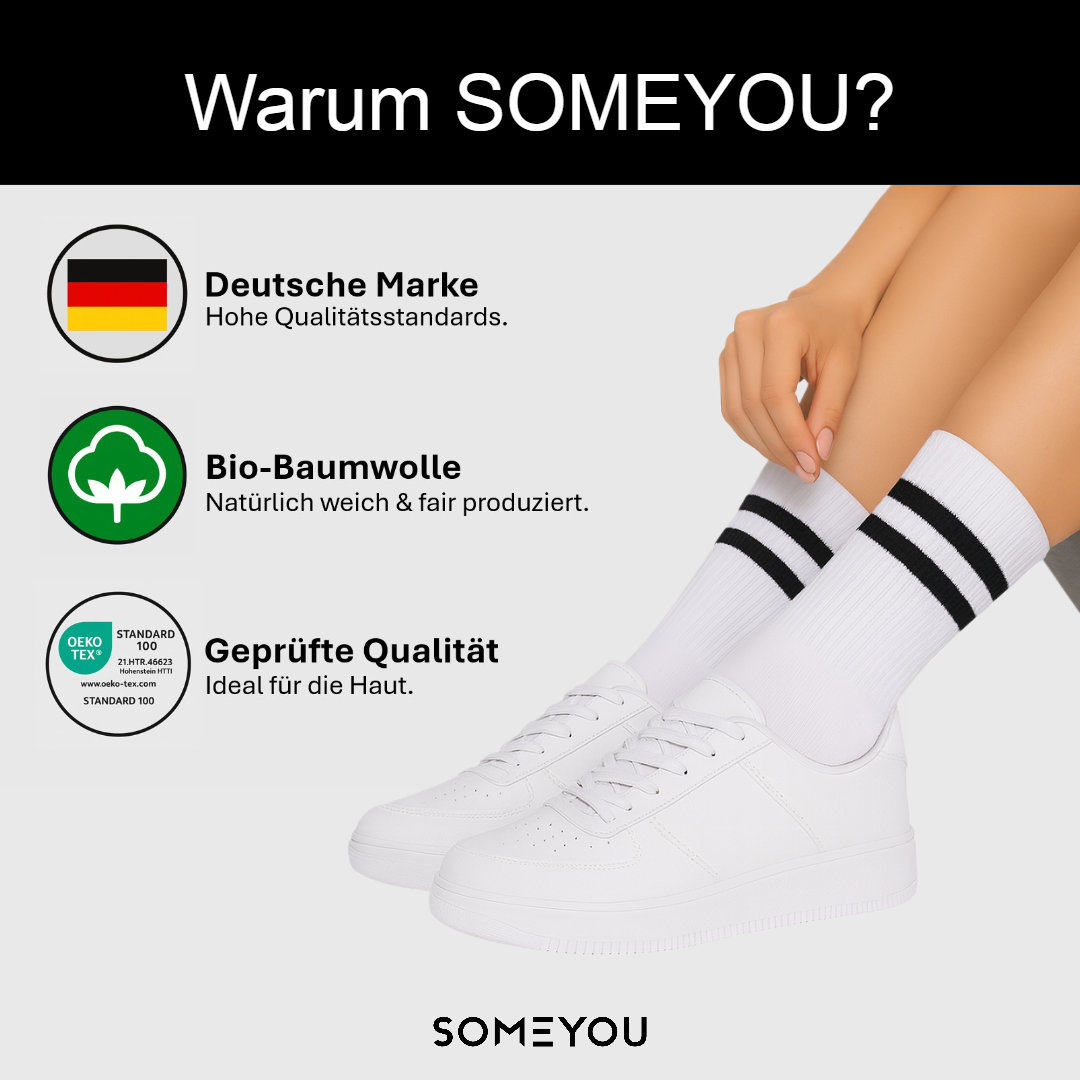 Unsere Tennissocken kombinieren coolen Style mit modernem Komfort. Aus einem nachhaltigen Mix aus Bio-Baumwolle, recyceltem Polyester und Elasthan bieten sie Weichheit, Formbeständigkeit und einen perfekten Sitz.