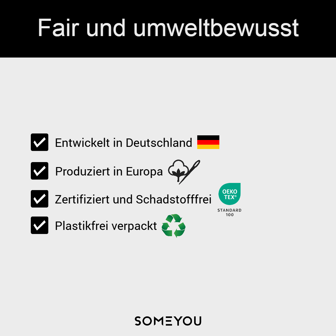Das Produkt trägt das OEKO-TEX® 100 Zertifikat, ein Label für schadstoffgeprüfte Textilien. Das Zertifikat setzt einen hohen Standard für die Sicherheit von Textilien – von den Garnen bis zum fertigen Produkt. Jeder Artikel wurde auf schädliche Chemikalien getestet und ist somit unbedenklich für dich und deine Haut.